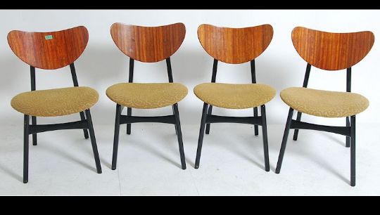 A set of 4 1970's G-Plan teak wood butterfly chairs being raised on ebonised tapered supports with pad seats. Measures: 78cms high x 47cms wide x 56cms deep.