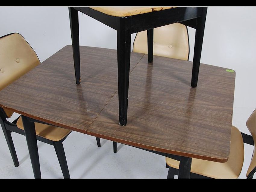 A set of four vintage 20th century G-Plan inspired dining chairs with ebonised frames vinyl seat pads and vinyl angular back rests. Along with an extendable dining table. Measures: 72cms high x 107cms wide x 76cms deep.