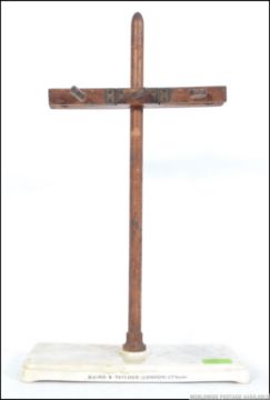 A vintage early 20th century apothecary / chemist test tube chemical holder by Baird and Tatlock. Having a central support with twin test tube clips raised on a ceramic base with advertising notation to the front for Baird and Tatlock. Measures: 50cms high.