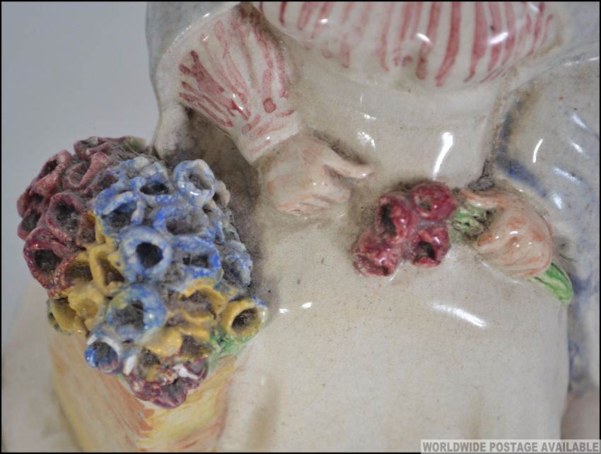 An early 20th century figure of a lady flower seller. marked to the interior J Carter 1928 possible Poole pottery. Measures:16cms high.