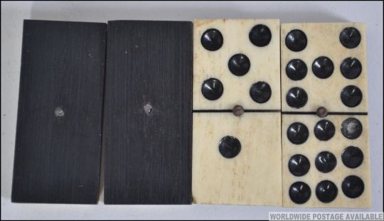 A cased set of late 19th century bone and Ebony studded dominoes, the dominoes going from numbers one to nine. 52 dominoes in all.