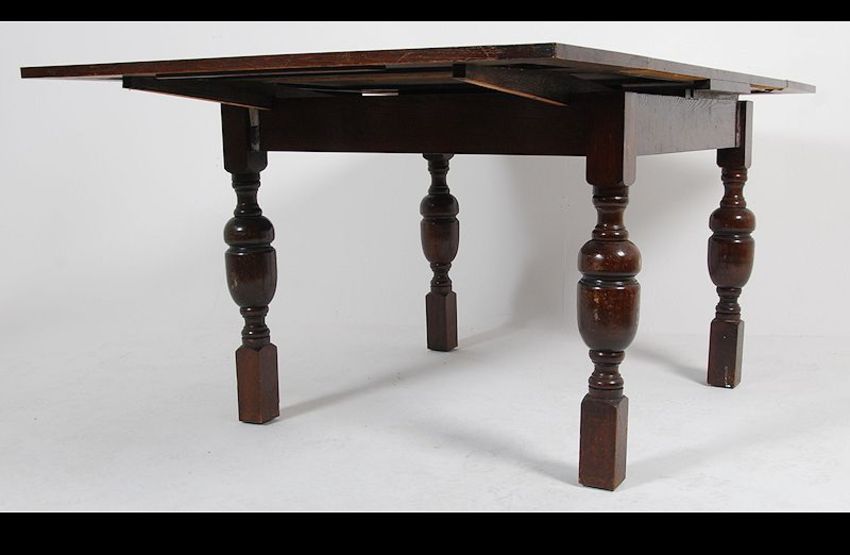 An early 20th century oak draw leaf refectory dining table raised on block and turned legs with fitted frieze and extending top. Measures: 77cms high x 94cms wide x 94cms deep.