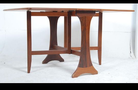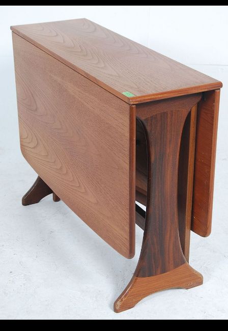 A retro 20th century G-Plan teak drop leaf dining table having splayed foot frame, the end leaves rising on gate legs. Measure: 73cms high x 136cms wide x 92cms deep.