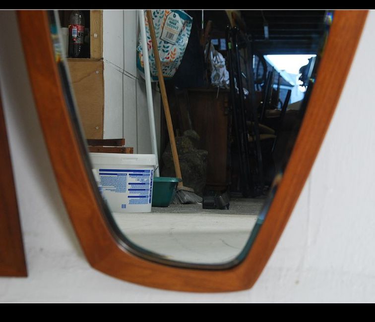 A 1970's Danish teak wood wall mirror of shaped form being stamped Made in Denmark to verso together with another similar