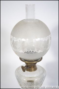 An early 20th century brass and marble oil lamp raised on a three tier square base with marble column holding the glass reservoir. Complete with etched glass shade and flume. Measures 78cms high
