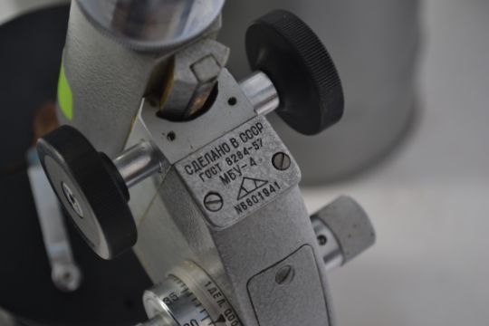 Russian cased microscope . DEPARTMENT OF ENVIRONMENTAL HEALTH has been scratch engraved to metal case