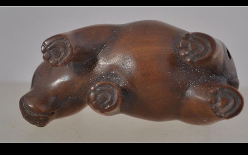 A well carved wooden Japanese netsuke in the form of a hippo,pierced holes to the rear