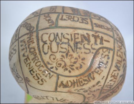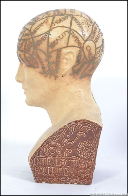 A 20th century ceramic Fowler's Phrenological head, marked to the front Fowler's Improved Phrenological Head and to the side Intellectual Faculties. With an unusual brown finish please see images. Measures: 28cms high.