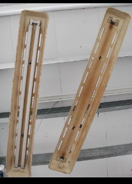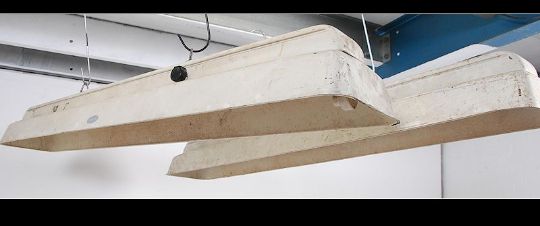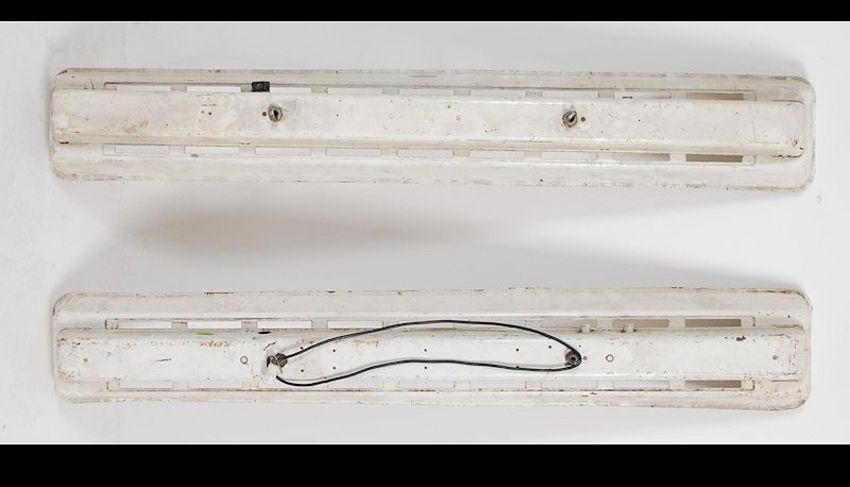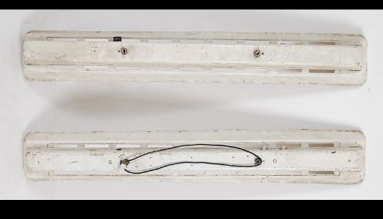 A pair of 1950's vintage industrial factory enamel strip lights. Having original suspension hooks to the top with two strip lights below the enamel hood. English made by Taskmaster. Measures: 19cms high x 170cms wide x 25cms deep.