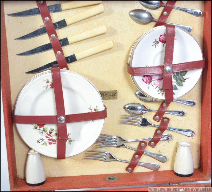A vintage 20th century retro Brexton picnic case in red being fully fitted with flasks, lunch containers, plates, cutlery etc. (appears complete). Measures: 40cms wide.