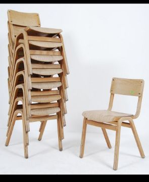 A set of 8 vintage mid century stacking school chairs raised on angled frames with panel seat and back rests. Measures: 75cms high x 41cms wide x 43cms deep.