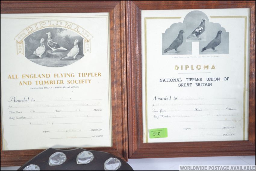 A collection of silver hallmarked pigeon racing medals set to a wooden plaque with silver notation bar for ' Coronation Year Cup June 20th 1953 S Williams 18Hours ' Together with another trophy plaque for HDHS English Average and 2 framed and glazed 1950's