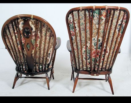 A pair of Ercol beech and elm wood Windsor pattern armchairs raised on turned legs with stretchers and cushions above. Matching rocking chair and 2 seat sofa in lots 1004 / 1003. Measures 104cms high x 73cms wide x 73cms deep