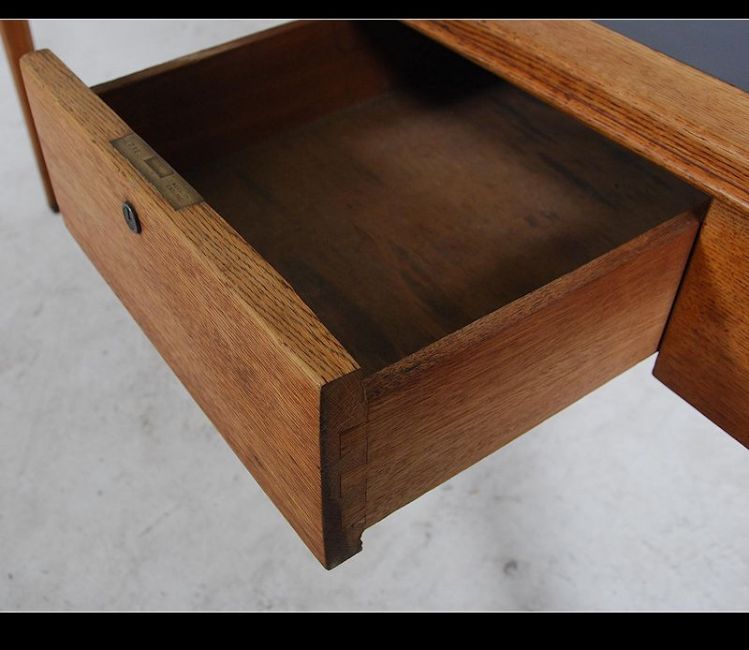 A mid century golden oak Air Ministry military desk raised on tapered legs with drawers to the frieze. Measures: 77cms high x 138cms wide x 77cms deep.