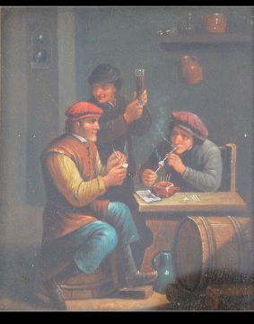 A good pair of original Continental framed and glazed unusual oil on tin paintings depicting men smoking clay pipes in an alehouse / pub . Labelled to verso J.H. Welsh picture framer Bristol , 1921 . Both unsigned . Measures: 20cms high x 16cms wide.