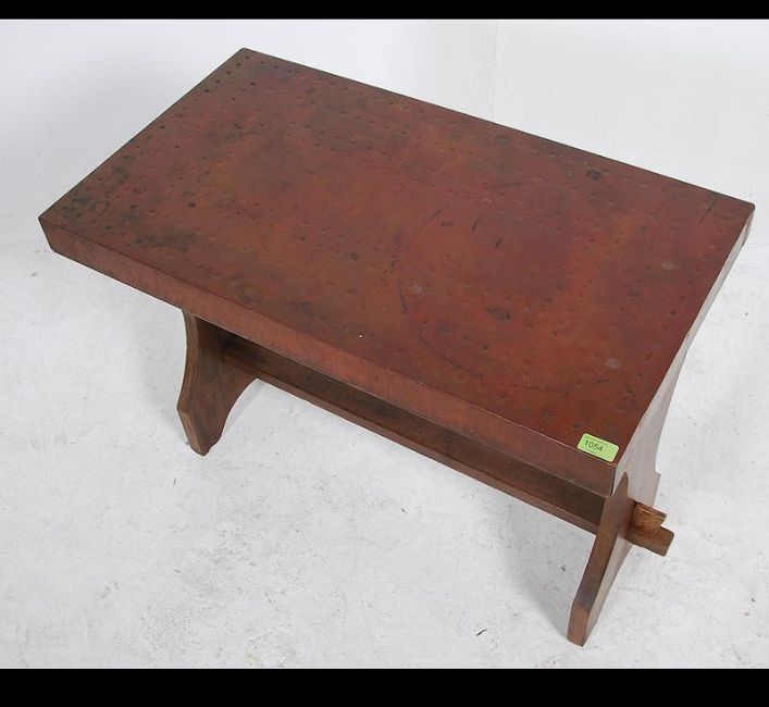 A great coloured / patina copper topped tavern table with hammered detailed top. Raised on a solid Elm wooden frame with a pegged cross frame. Measures: 62cms high x 80cms wide x 45cms deep.