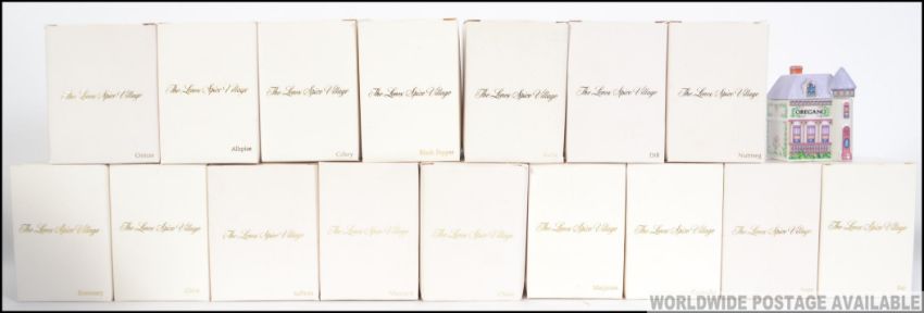 A collection of 19 collectable Spice Houses / Spice Village - Spice jars. Each ceramic house of a different design with notation for herbs and spices from Saffron to Oregano. In original boxes.