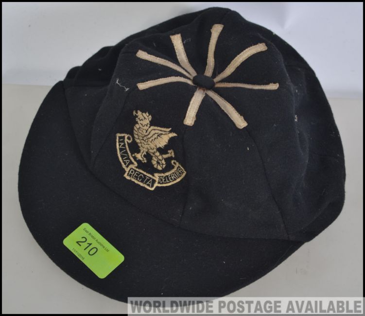 A Vintage early 20th century school cap in black with rope braid having central crest with latin inscription reading invia recta celeritea.