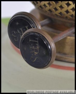 An early 20th century brass and ceramic oil lamp rasied on a two tier circular base with a brass column holding the hand painted ceramic reservoir. Complete with etched glass shade and flume. Bearing makers marks TRS. Measures 67cms high.