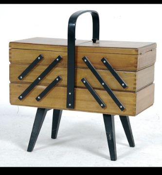 A 1950's metamorphic sewing box raised on tapered legs with multi opening action and central handle. Measures: 46cms high x 42cms wide x 24cms deep