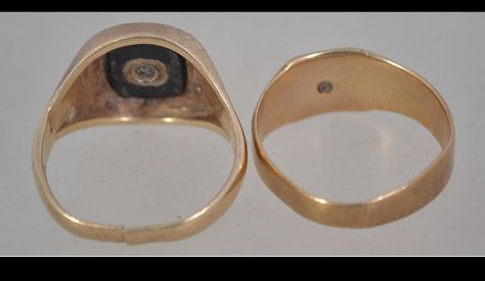 A hallmarked 9ct gold and diamond signet ring set with single diamond in a star cut setting. Hallmarked Birmingham. Total Weight 3.8g. Size U. Together with another with onyx and diamond Weight 6.9g. Hallmarked Birmingham Size U. With break to shank.