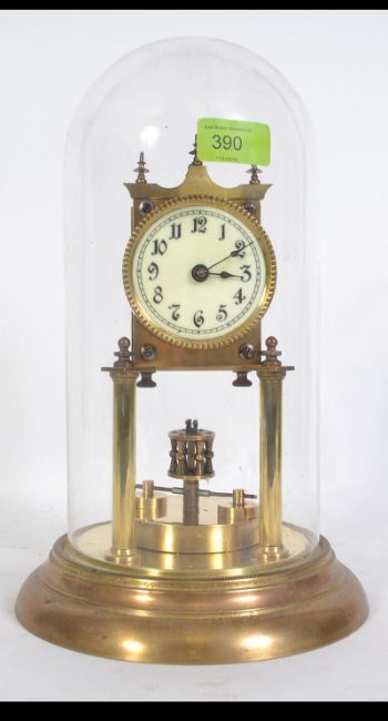 A cased anniversary 400 day clock with flat pendulum. A large example with glass dome and scrolled numbers to dial . A continental piece stamped 7439 to verso. Measures: 31cms high.