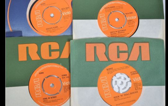 A collection of David Bowie 45rpm vinyl 7" singles to include Drive in Saturday, Rock & Roll Suicide, Diamond Dogs, Panic in Detroit, Fame, Young Americans, Golden Years, TVC 15, Fantastic Voyage etc