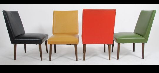 A group of four vintage / retro 20th century Lounge chairs each upholstered in a different colour faux leather material raised on tapering stub legs. Measures: 83cms high x 50cms wide x 65cms deep.