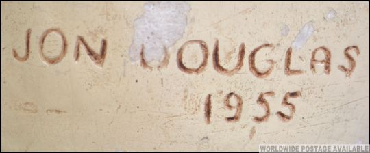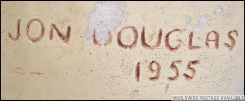 Jon Douglas 1955. A mid century plaster bust study of Sir Winston Churchill having inscribed notation to the rear and being raised on a black glass socle plinth base. Measures: 23cms long.