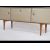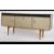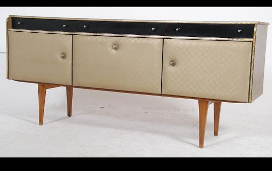 A mid century retro / vintage melamine sideboard dresser being raised on tapered legs with cupboards and drawers to the wide body. Measures: 74cms high x 168cms wide x 40cms deep.