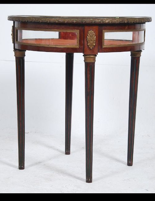 A French Empire style rosewood circular Bijouterie display cabinet / side table. Glass top opens out to reveal cushioned interior. Ormulu detail raised on reeded legs. Measures: 70cms high x 64cms diameter.