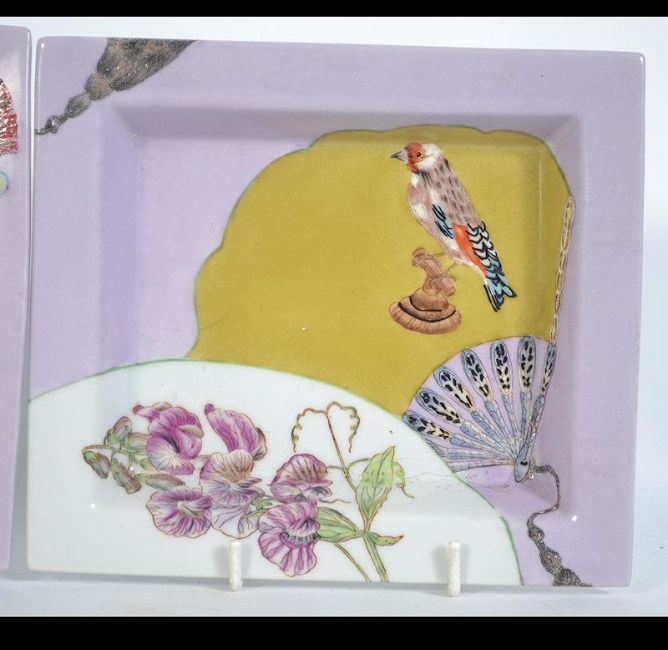 A set of 3 Fabienne Jouvin ceramic china dishes, each with handpainted Art Deco scenes of birds set to a lilac ground. Marked to the rear. Measures: 19cms x 17cms.