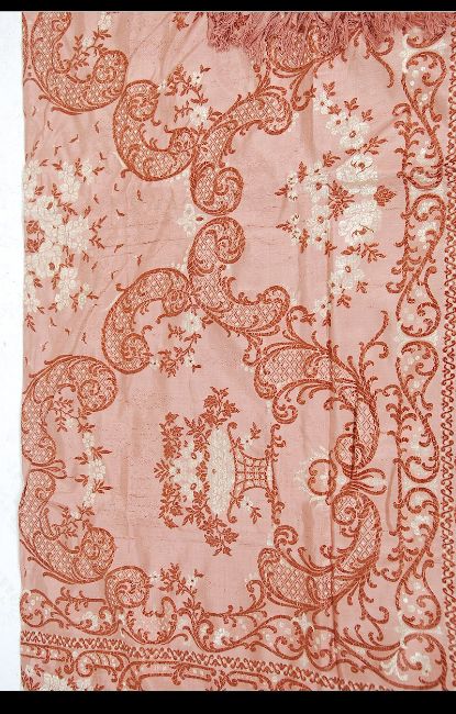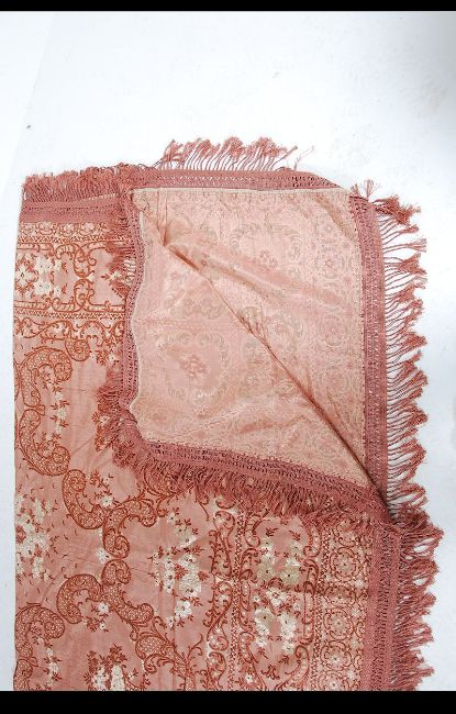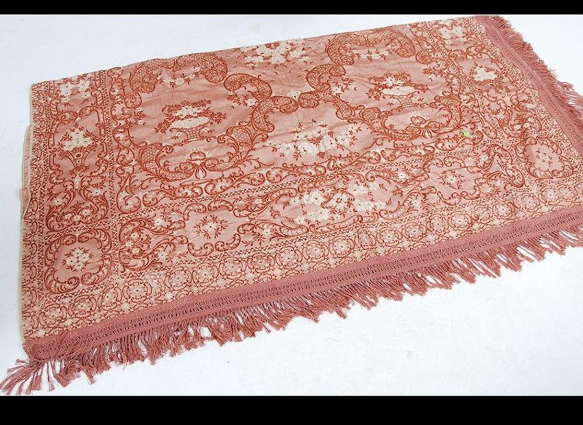 A believed Malayan - Eastern hand embroidered throw with tassled ends having been returned to the Uk during the mid century from a serving member of the armed forces. Measures: 240cms long x 216cms wide.