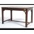 A mahogany leather topped campaign style rectangular table with pierced supports, gilt tooled leather top raised on peripheral stretchers. Measures: 42cms high x 71cms wide x 48cms deep.