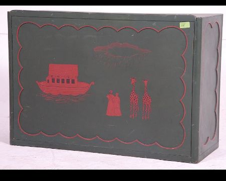 Large handmade wooden ark from a world famous toy shop. Hand painted with notation to side ' Mr & Mrs Noah and their ark ' . An excellent large boxed example with a slide up frontage full of hand carved animals . We have been informed by the vendor that it is complete. Measures: 53cms high x 83cms wide x 33cms deep.