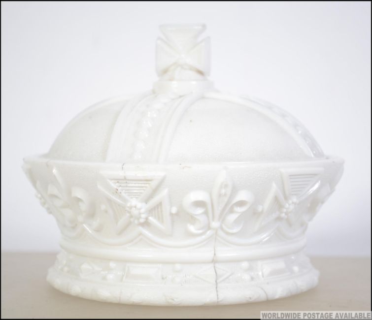 A 19th century Soweby Coranation ware white milk glass lidded pot / bon bon dish. Measures: 12cms high.