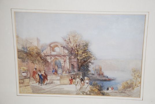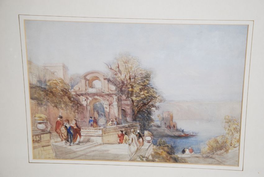 DAVID COX , Snr. , Sen. , O.W.S. ( David Cox The Elder ) Birmingham 1783 - 1859. Entitled ' A Romantic Riverscape With Figures On A Balcony ' watercolour painting being framed and glazed with notation to verso. This is a rare example and shows faint pencil marks and lines under paint. Gallery labels and catalogue pictures to verso.