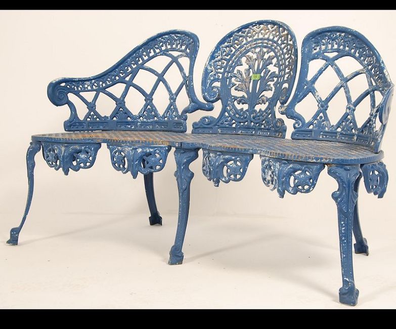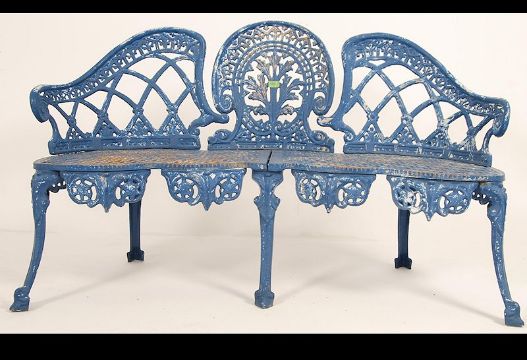 A stunning Coalbrookdale style blue painted rustic pattern heavy cast metal garden conversation bench if serpentine form beautifully weathered please see images. Measures: 82cms high x 140cms wide x 50cms deep.
