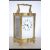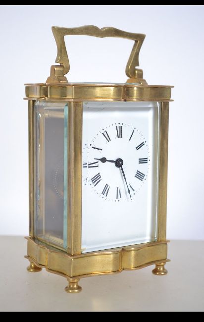 A good brass carriage clock with glass facia and shaped handle. open escapement top with window under shaped handle. Measures: 15cms high.