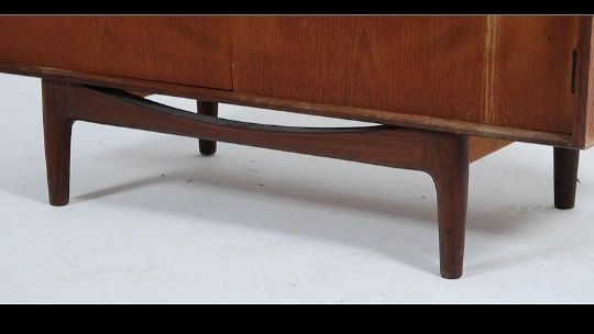 A 1970's vintage Danish inspired teak wood sideboard of small proportions raised on tapered legs with pierced frieze. Measures: 70cms high x 102cms wide x 46cms deep.