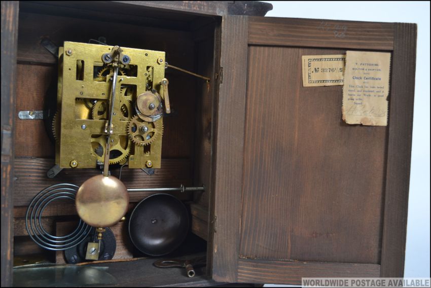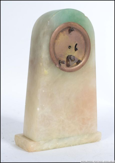 An Edwardian oak cased " Bugler " alarm mantel clock labelled to verso Thomas Fattorinis with original notation to interior along with a deco form alabaster mantle clock. Measures: 29cms high.