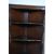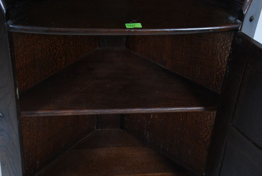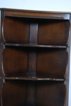 A 20th century Ercol dark wood corner bookcase cabinet having a qtr panel door with shelves atop