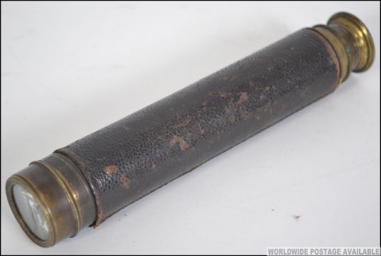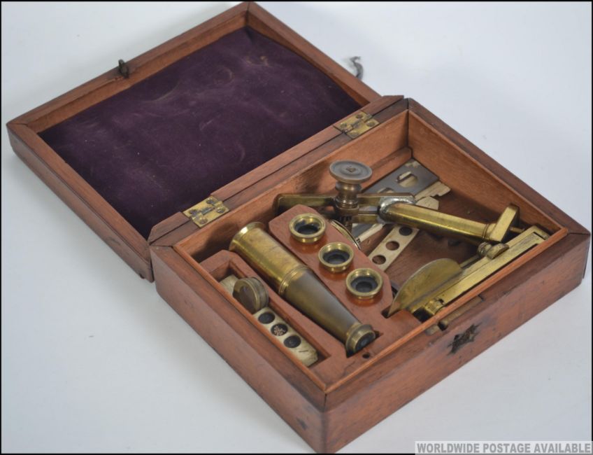An early 20th century brass 2 drawer telescope together with a Victorian boxed brass miniature microscope set to include bone - ivory slides with accessories ( see illustrations ). Measures: 18cms wide.