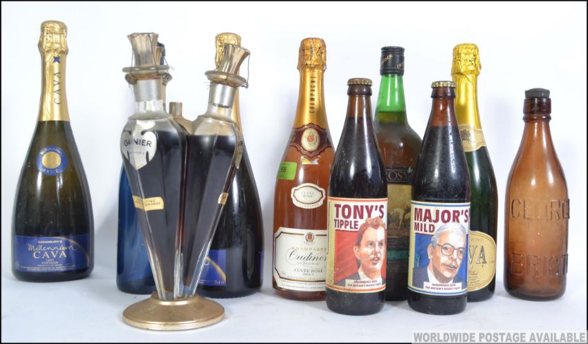 A collection of bottles to include contents, Champagne, collectable beers to include Tony's tipple and Majors Mild, also Garnier Brandy and many others