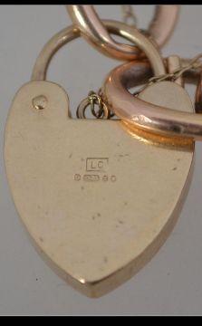 A 9ct gold chain link bracelet with later 9ct gold heart lock. Lock hallmarked London. Bracelet links Victorian hollow links with foliate decoration marked 9c and tests 9ct gold. Measures approx 9inches. Total weight 24g.