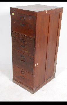 A 1930's Air Ministry four drawer wooden filing cabinet, dark stained with metal pull handles. Stamped to the rear with AM and crown mark. Measures: 132cms high x 51cms wide x 65cms deep.