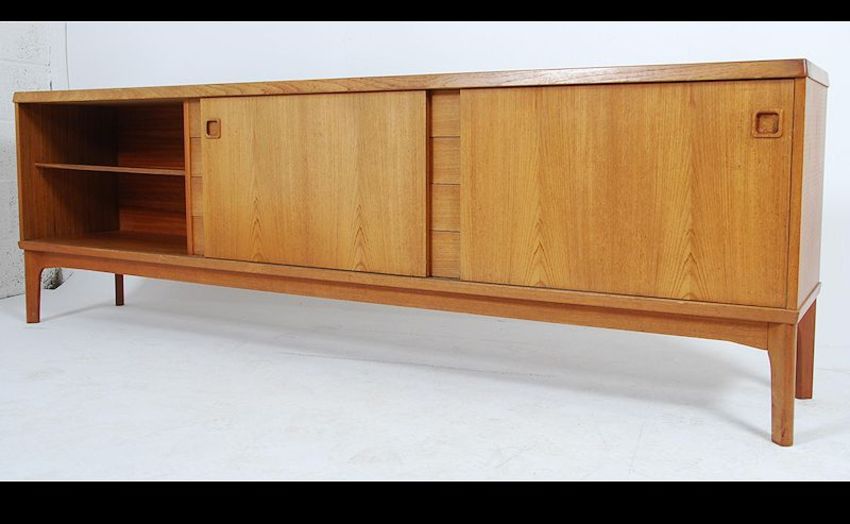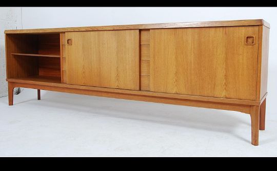 A 1970's good Danish blond teak wood sideboard raised on squared legs with a series of cupboards having central bank of drawers. Measures; Height 77cm x Width 240cm x Depth 42cm.