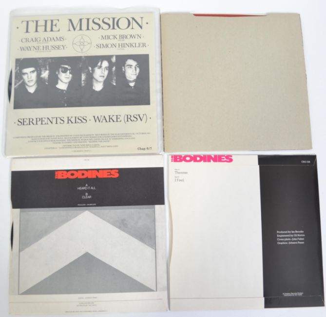 The Mission ' Serpents Kiss ' 45rpm vinyl single. Signed by all the original line up to the front cover along with three 45rpm singles from Creation records to include The Bodines x 2 ' Heard it all ' and ' Therese ' along with Heavy ' Mouse In A Hole '. All vinyl mint