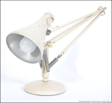 A vintage Herbert Terry anglepoise post war model Industrial desk lamp raised on round terraced base with pendant shade