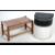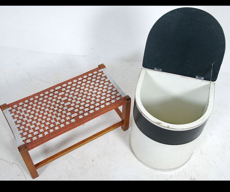 A retro 20th century 1960's two tone black and white vinyl laundry basket with hinged lid along with a retro footstool having a woven top. Measures: 43cms high x 36cms wide x 33cms deep.